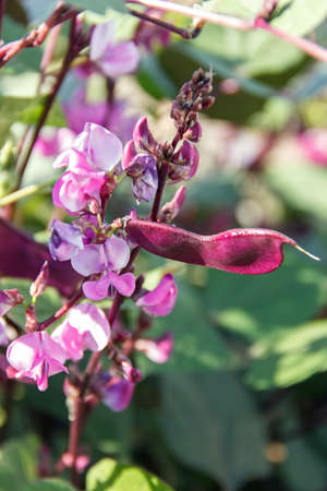 Dolichos flower blooming lilac color among bright green leaves outdoor.