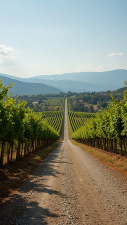 A winding dirt road leads through lush vineyards to a charming hillside town. The dramatic clouds and soft light create a serene atmosphere, highlighting the region's picturesque landscape.