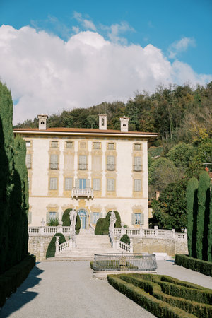 Trimmed bushes and trees in the garden near the ancient Villa Canton. Bergamo, Italy