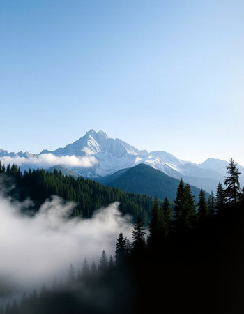 Mountain landscape with coniferous forest and snow-capped peaks.