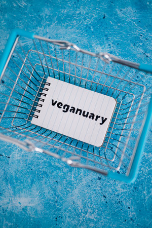 HOBART, AUSTRALIA - january 2nd, 2021: healthy plant-based nutrition concept, Veganuary memo inside grocery shopping basket, illustrative editorial