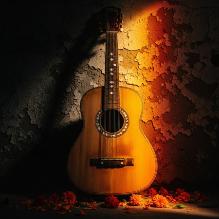 A vibrant guitar stands against a colorful mural, showcasing intricate floral patterns and bright hues that evoke a sense of artistic celebration and culture.