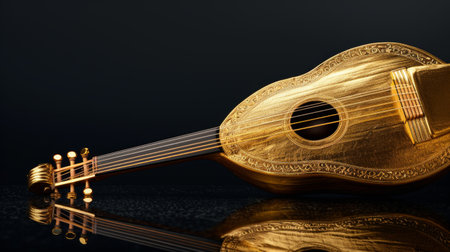 stunning golden lute rests gracefully on a sleek black marble surface, exuding a sense of timeless beauty and musical allure.