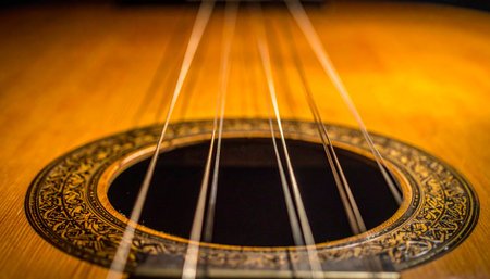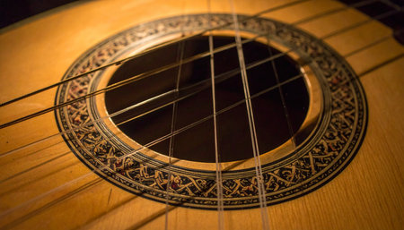 A detailed close-up captures the warm, golden wood and intricate rosette of an acoustic guitar.