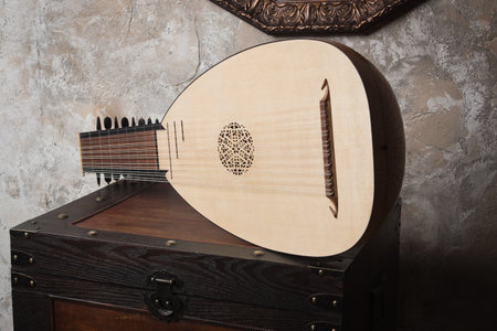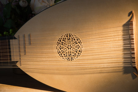 Renaissance lute (citole) in a dark room. Close up detail