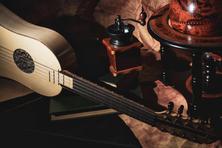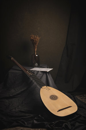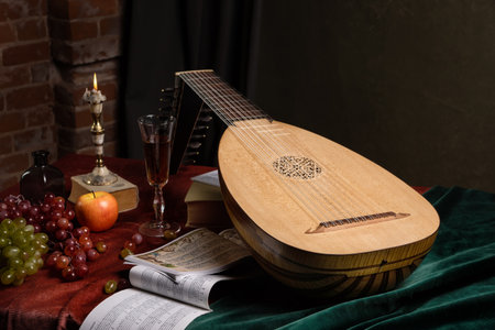 Musical still life in the Renaissance style with renaissance guitar