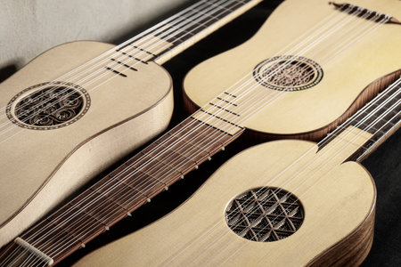 Baroque guitar of the 17th century. Close-up details