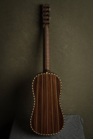 A close-up view reveals the beautiful grain and craftsmanship of a traditional wooden string instrument.