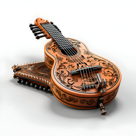 A beautifully crafted mandolin rests on a vibrant textile, showcasing intricate designs that highlight the art of music and craftsmanship in traditional culture.