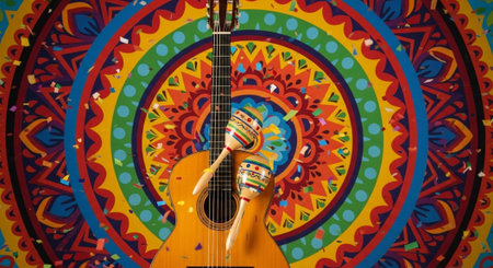 Mexican guitar and maracas in front of a colorful patterned background
