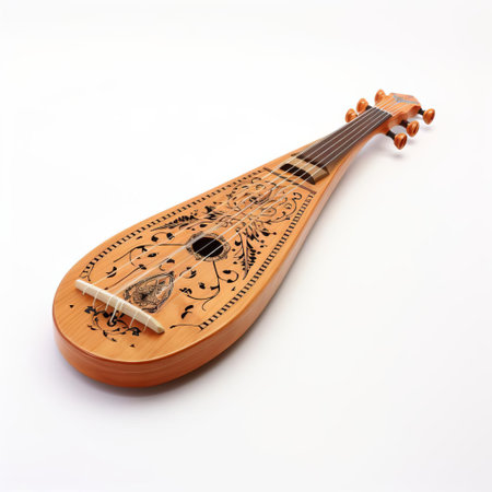 An antique lute is presented against a clean white backdrop. The instrument displays a detailed wood grain texture with varying shades of brown and a visible rosette. The composition focuses on the lute's form and intricate design. This image is suitable for various commercial uses, including music-related content.