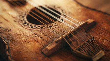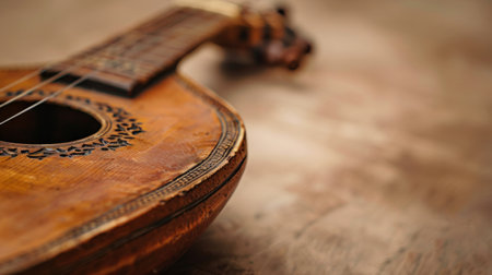A stunning string instrument positioned gracefully on a table, surrounded by warm lights. Perfect representation of music's beauty and cultural richness.