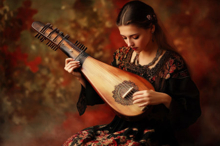 A skilled musician strums a lute, filling the softly lit room with a peaceful, warm atmosphere.
