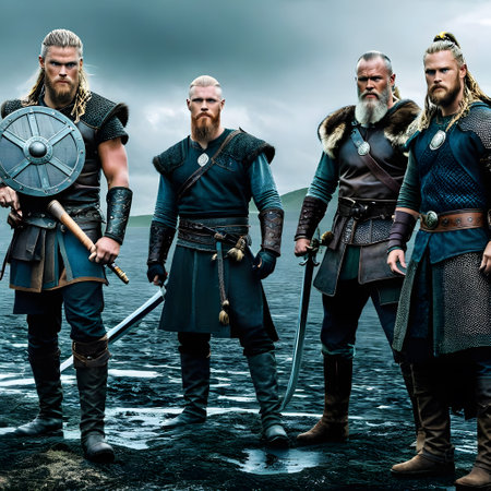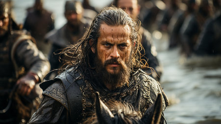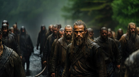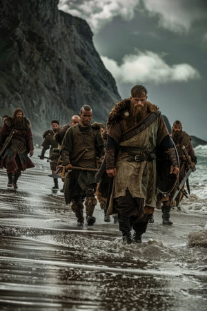 A group of Viking warriors are walking across a beach. Scene is one of adventure and camaraderie