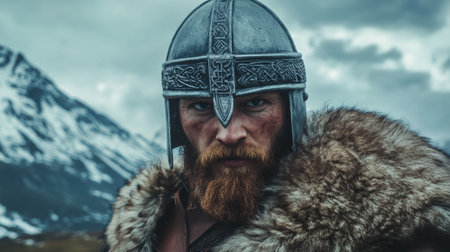 A fierce Viking warrior with battle-worn face and helmet stars intensely amidst a snowy mountain landscape, exuding strength and determination.