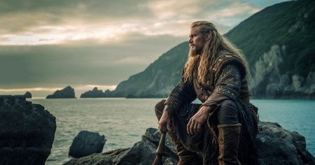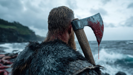 Mysterious Viking warrior with bloodied axe overlooking stormy sea