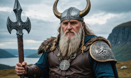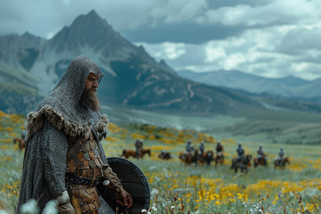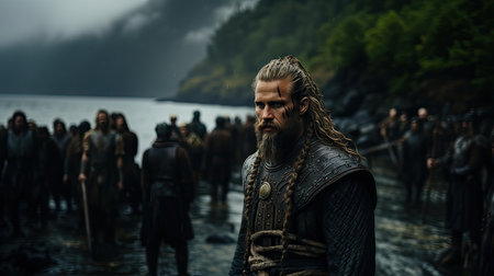Warrior stands proudly at lakeside, gazing into the distance. Dramatic clouds accentuate rugged landscape. Concept of adventure, exploration, historical reenactment.
