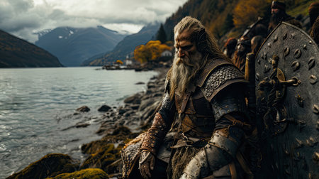 A rugged Viking warrior, clad in traditional armor, stands ready with his axe and shield along the rocky shores of a fjord. Dark skies and distant mountains set a dramatic scene.