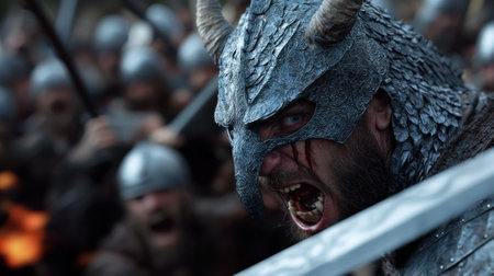 Photo of knights in armor with swords during the war. Evil emotions of a warrior who goes to battle with the sword.