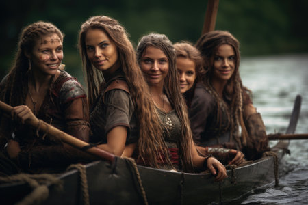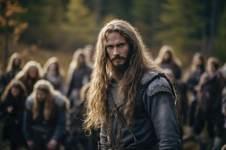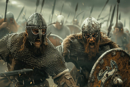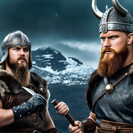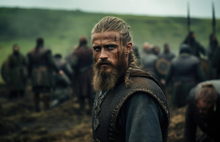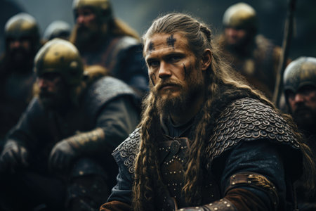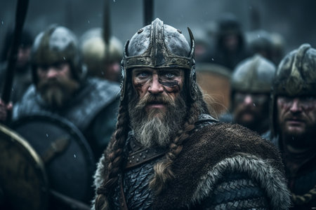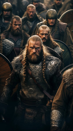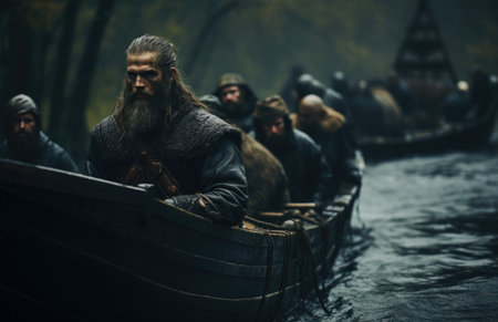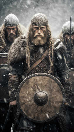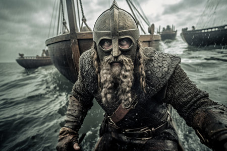 Vikings, Varangians early medieval Scandinavian seafarers in 8th and 11th centuries who made sea voyages. Swedish, Norwegian Danish. Covenanters, Assault. Occupiers Scandinavia Nordic. Generative AI.