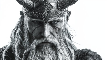 Watercolor portrait of a serious bearded norse warrior in war helmet against white background