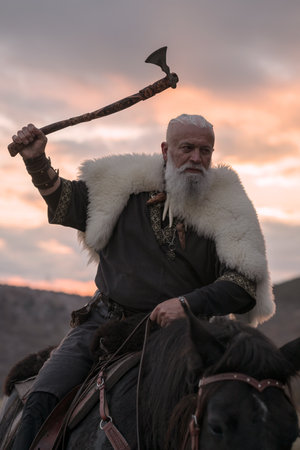 A fierce Viking warrior on horseback, wielding an axe, stands against a dramatic sunset sky with clouds and mountains, embodying strength, exploration, and ancient legend.