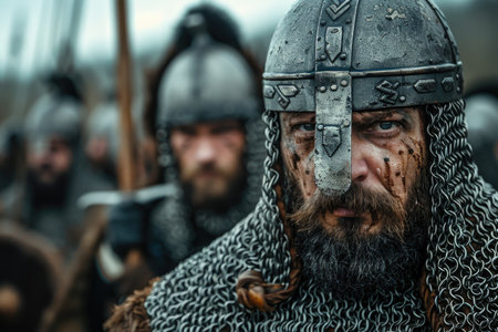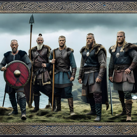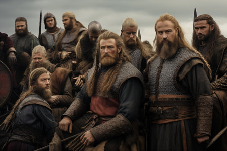 Group of vikings in various colored tunics. Showcasing Viking seax and chainmail armor. Generative AI