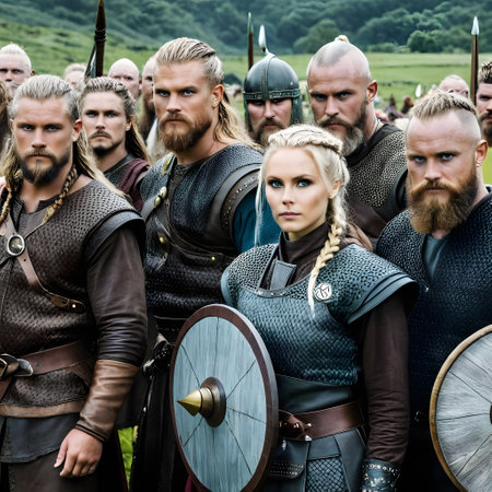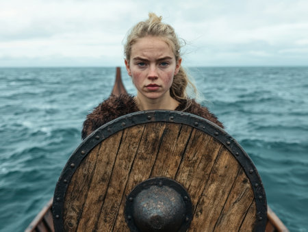 Viking Queen with Long Braid Contemplates Majestic Fleet of Warships in Norwegian Fjord