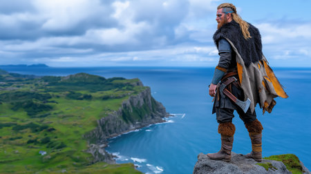 A Viking warrior stands on a rocky cliff, looking out over the expansive blue ocean. The dramatic coastline and lush green hills create a breathtaking backdrop under a cloudy sky.