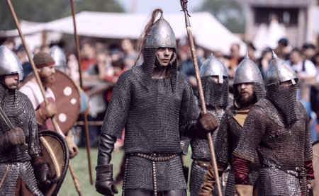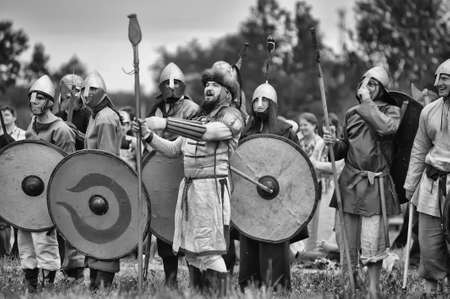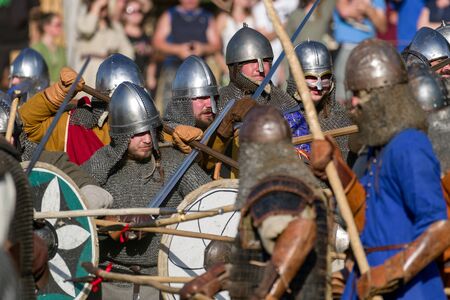 DROHICZYN, POLAND, July 8: Medieval warriors during the fight on Vikings, Baltics and Slavic warriors meeting on July 8, 2017 in Drohiczyn, Poland.