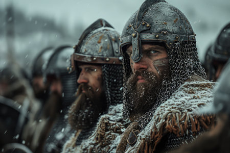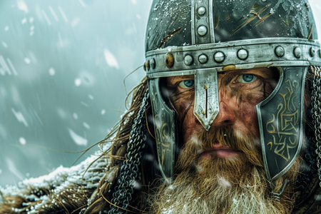 Portrait of a fierce warrior in a horned helmet, snow falling