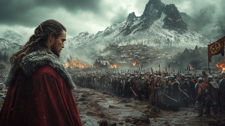 A fierce warrior stands with a sword, embodying strength and courage. The dramatic landscape sets the stage for an epic adventure, capturing history and valor.