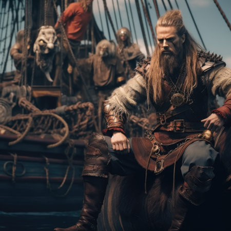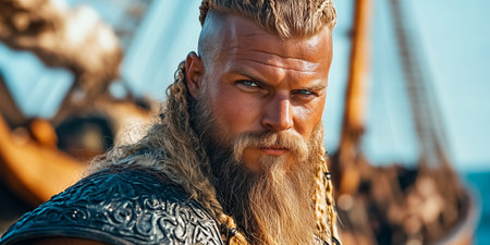 Strong warrior with braided hair and beard poses confidently against pirate ship backdrop. Clear blue sky creates adventurous setting.