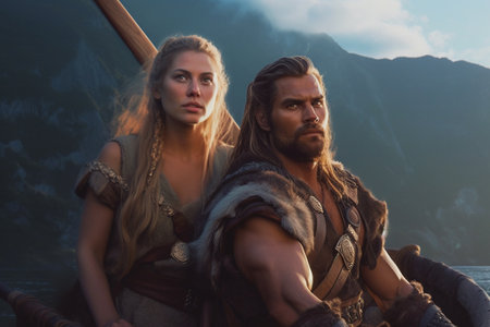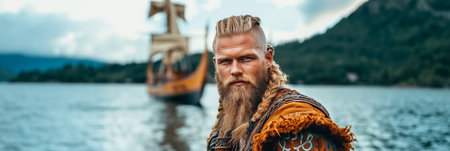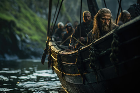 Strong viking warrior sailing on traditional wooden boat across Norwegian fjord during epic adventure