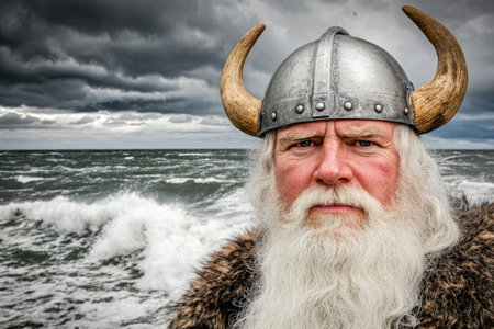 Viking Warrior Close-up by the Sea - Fierce Nordic Character with Helmet and Beard for Historical and Fantasy Themes.