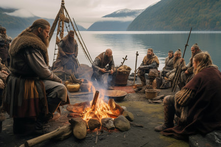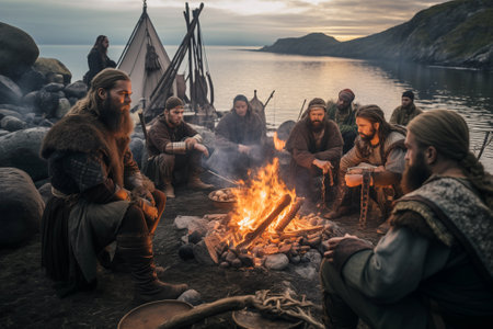 Group of vikings sitting together nearly bonfire. Many men having dinner and resting at nature. Generative AI