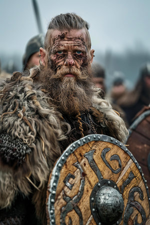Viking warrior,Medieval warrior berserk Viking with tattoo on skin, beard and braids in hair with ax and shield attacks enemy. Concept historical photo nordic