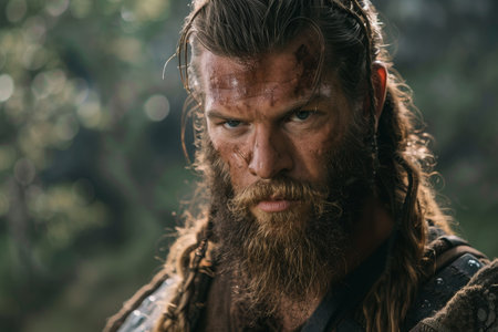 A man with long braided hair and a thick beard stands in a forest, showing a serious expression. His eyes display strength, reflecting deep thought amidst a serene backdrop.