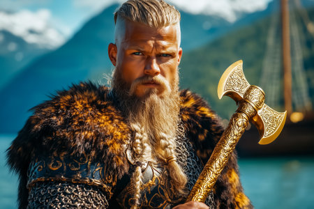 Warrior holding intricate axe looks at camera with intensity in striking photo-realistic setting. Surrounded by majestic mountains and a Viking ship. Concept of adventure, history, storytelling.