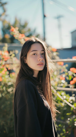 A stunning portrait of a young woman with flowing hair, reflecting natural light. Her serene expression captures a moment of confidence and authenticity.