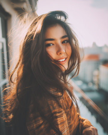 A young woman with long, dark hair is smiling at the camera while standing on a balcony. The sun is setting behind her, casting a warm glow on her face and hair. She is wearing a plaid shirt.