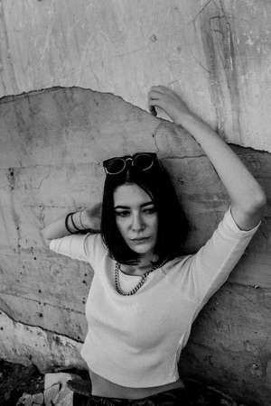 Lonely woman leaning against concrete wall in urban environment.