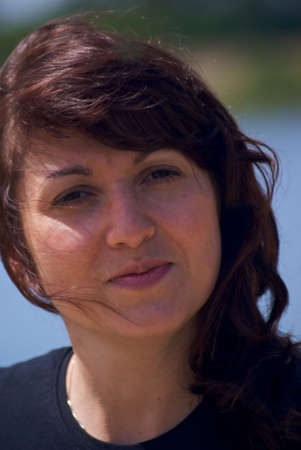 Nice girl with long red hair is standing on the background of a water surface. Portrait of a woman without retouching with her natural imperfections