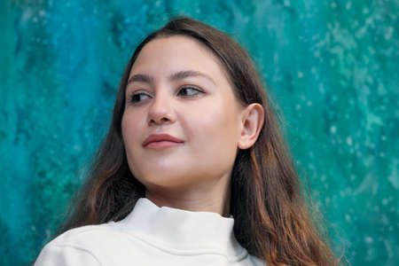 Portrait of a young beautiful girl with long wavy hair in a white sweater