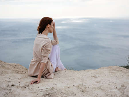 Beautiful relaxed young woman sits on a stone near the sea.