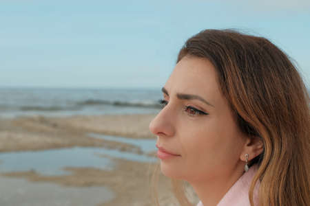 Portrait of pretty young woman posing on the Baltic sea beach in autumn