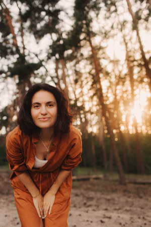 Portrait of a smiling woman combing her hair with her hand. In the background is a dramatic sunset. The concept of psychology and mental health.