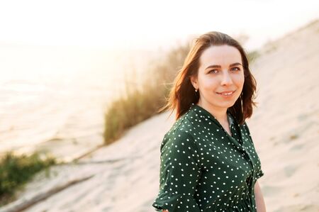 Portrait of a young cute woman on the background of the sea at sunset