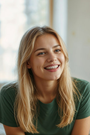 Portrait of happy blonde woman in green t-shirt on blurred background of bright living room