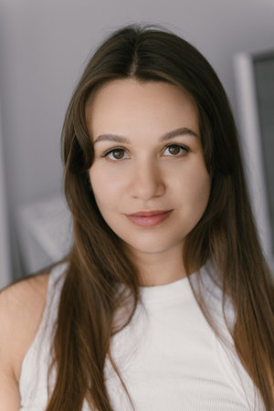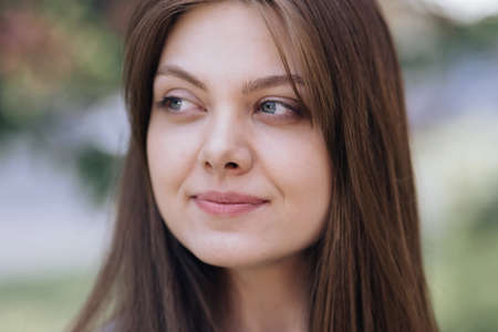 Close up portrait of beautiful young Caucasian brunette woman with fair skin